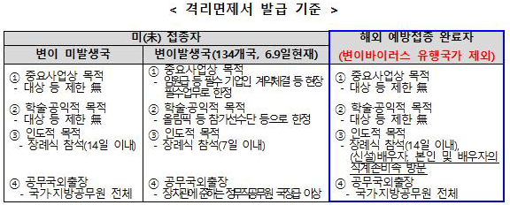 7월 1일부터는 해외 예방접종 완료자가 격리면제를 신청하는 경우 중요사업상 목적, 학술 공익적 목적, 인도적 목적 등 현재 변이 미발생국에서 입국하는 사람들에 대한 격리면제 기준을 적용하여 심사할 계획이다.