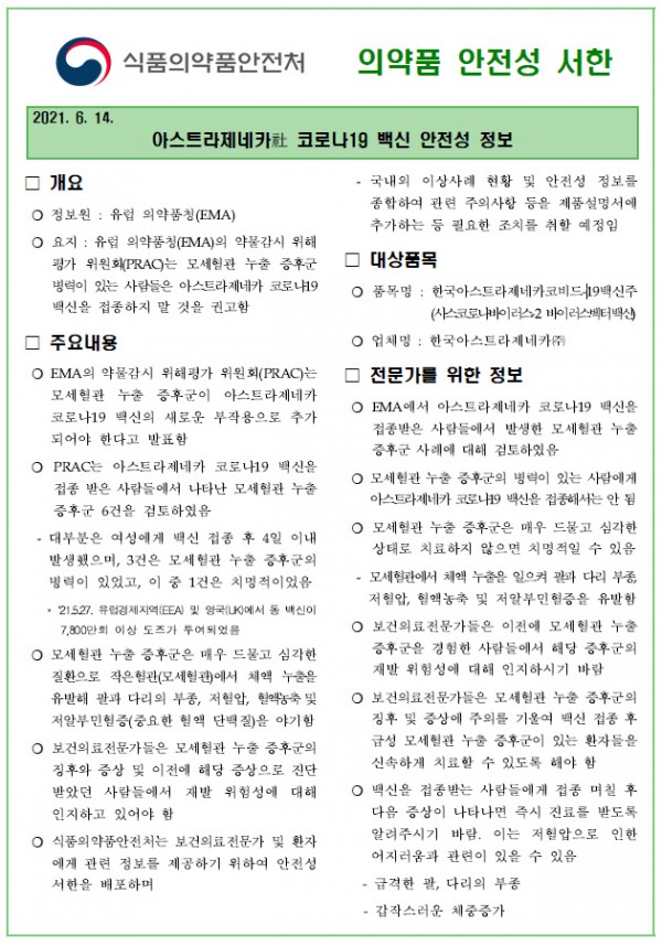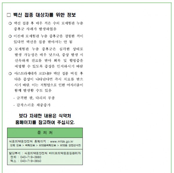 [식약처]‘모세혈관 누출 증후군’, 아스트라제네카 코로나19 백신의 새로운 부작용으로 추가