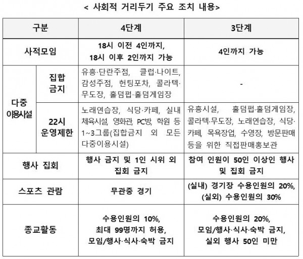 * 3단계 수칙상 동거가족, 돌봄·임종, 스포츠 영업시설, 예방접종 완료자만 예외를 인정하나, 현재 비수도권에서 직계가족 모임, 상견례는 한시적 수칙으로 허용 중