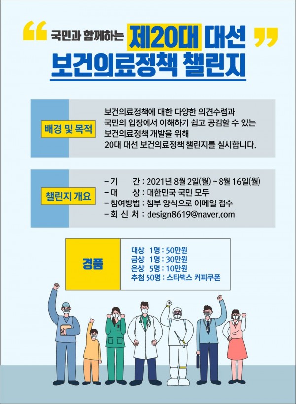 대한의사협회 의료정책연구소는 2022년 3월로 예정돼 있는 제20대 대선에 대비하여 국민건강과 올바른 보건의료제도 확립을 위하여 아래와 같이 6개 주제를 핵심 아젠다로 삼아 보건의료정책 제안서를 작성 중에 있습니다.