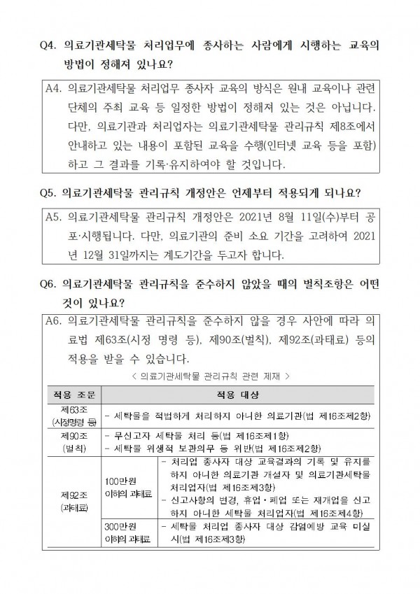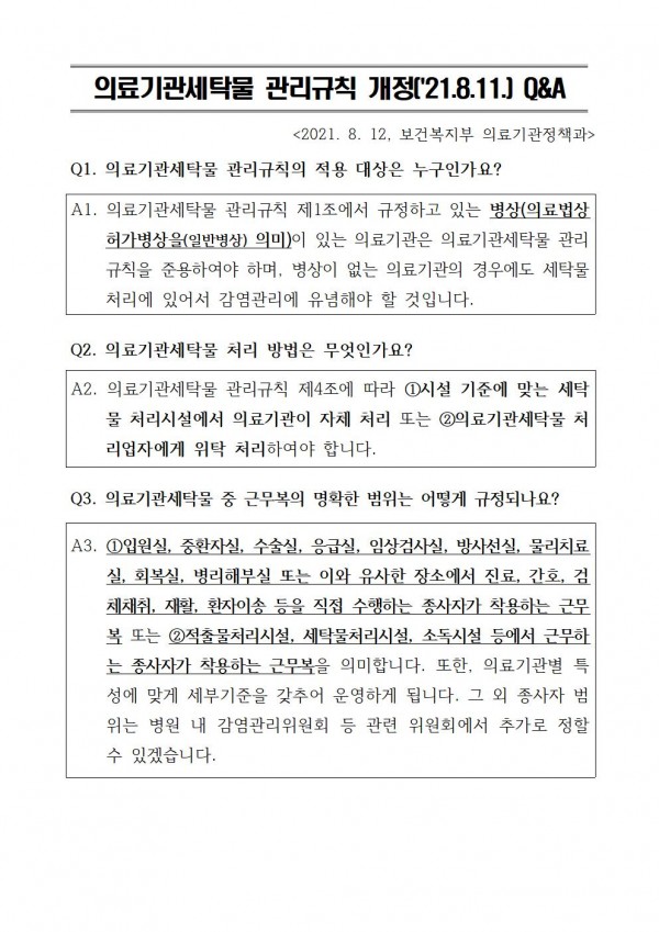 □ 보건복지부는「의료기관세탁물 관리규칙(보건복지부령)」 일부개정안을 2021년 08월 11일(수)부터 공포·시행한다고 밝혔다.