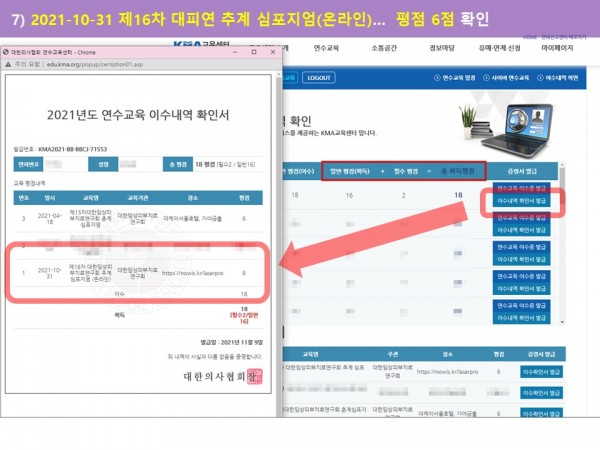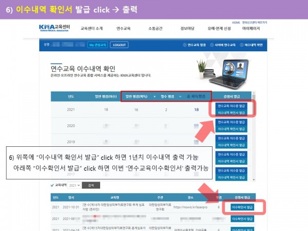 6) 위쪽에 “이수내역 확인서 발급” click 하면 1년치 이수내역 출력 가능