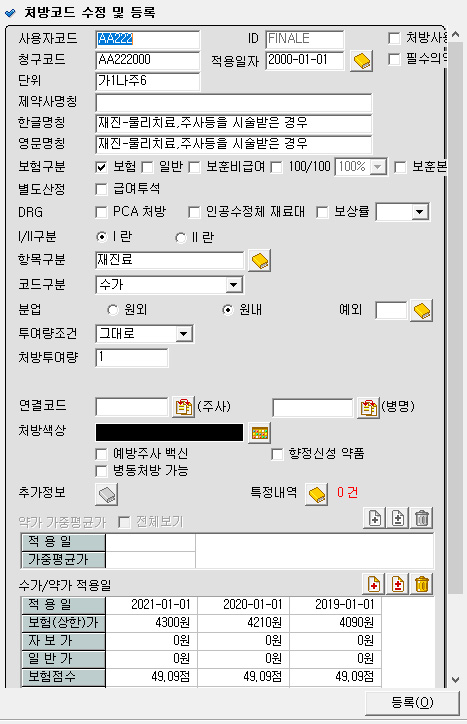 위에 코드를 넣으면 재진이나 초진 대신에 AA222 code가 입력되면서 36% 삭감된 진찰료가 청구 됩니다.