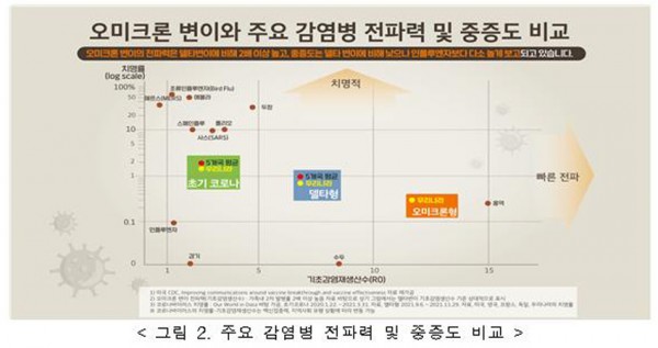 - 오미크론 변이는 델타 변이보다 전파력 높으나 중증도 낮음, 인플루엔자보다 전파력 높고 중증도 다소 높음