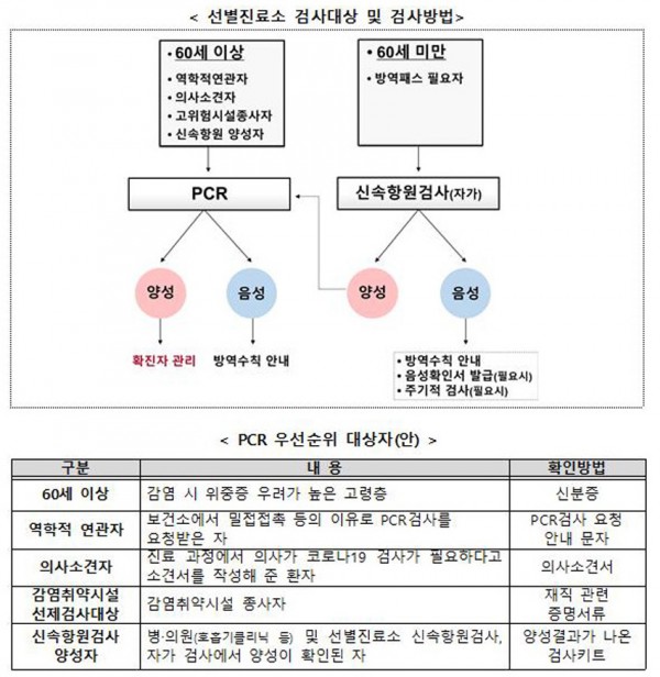 ○ 보건소 선별진료소 PCR검사는 60대이상 고위험군(우선검사필요군)에 집중하며, 이외 대상자는 보건소 선별진료소 자가 신속항원검사를 활용하고, 유증상자는 호흡기전담클리닉 등 지정 의료기관에서 진료와 검사(전문가용 신속항원검사)를 시행한다.