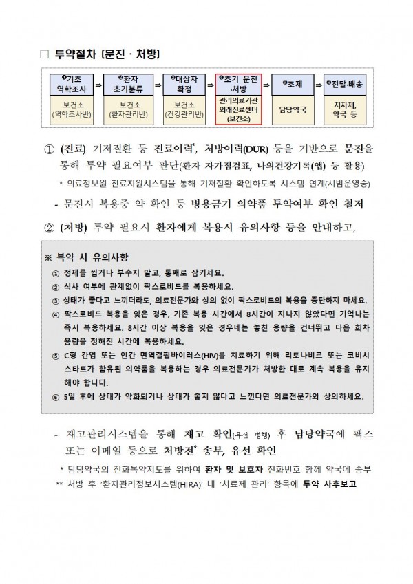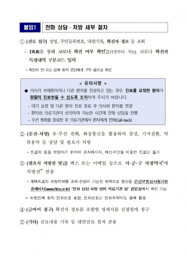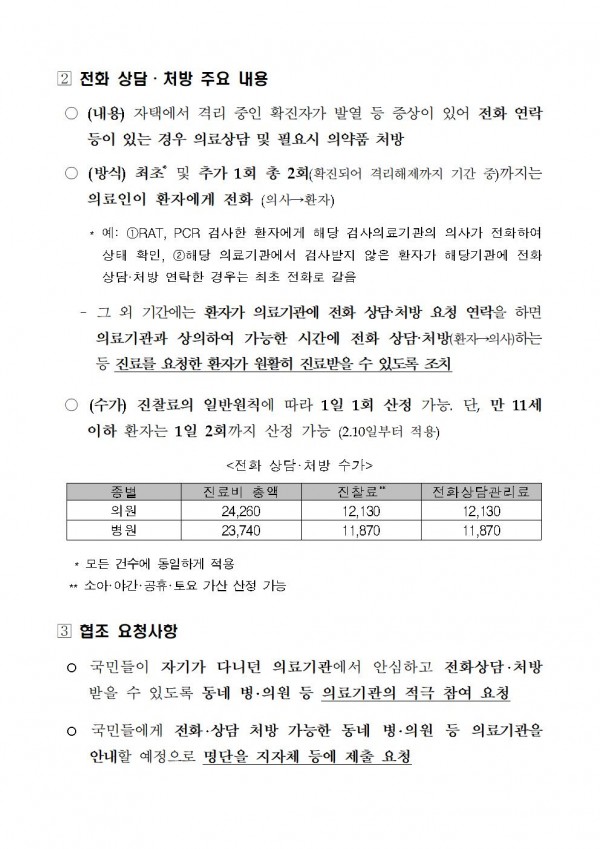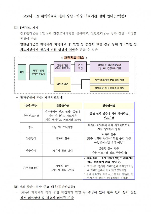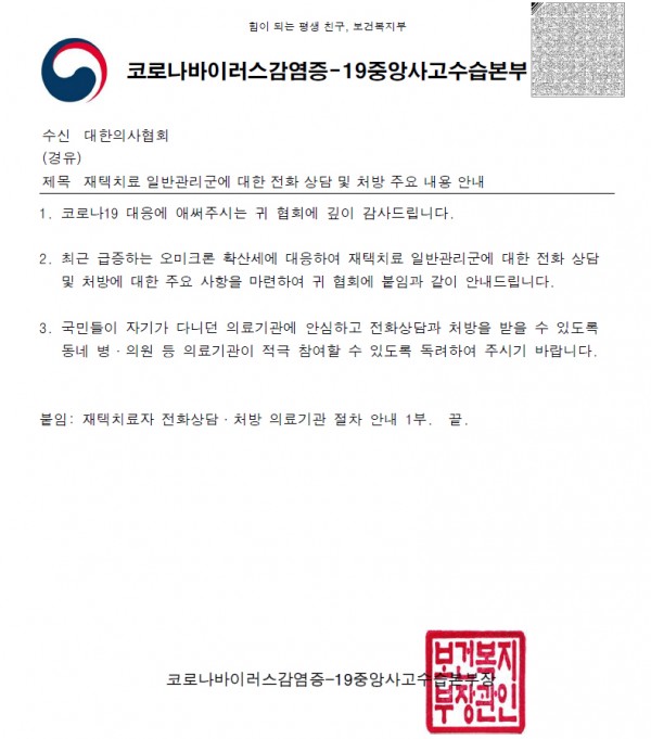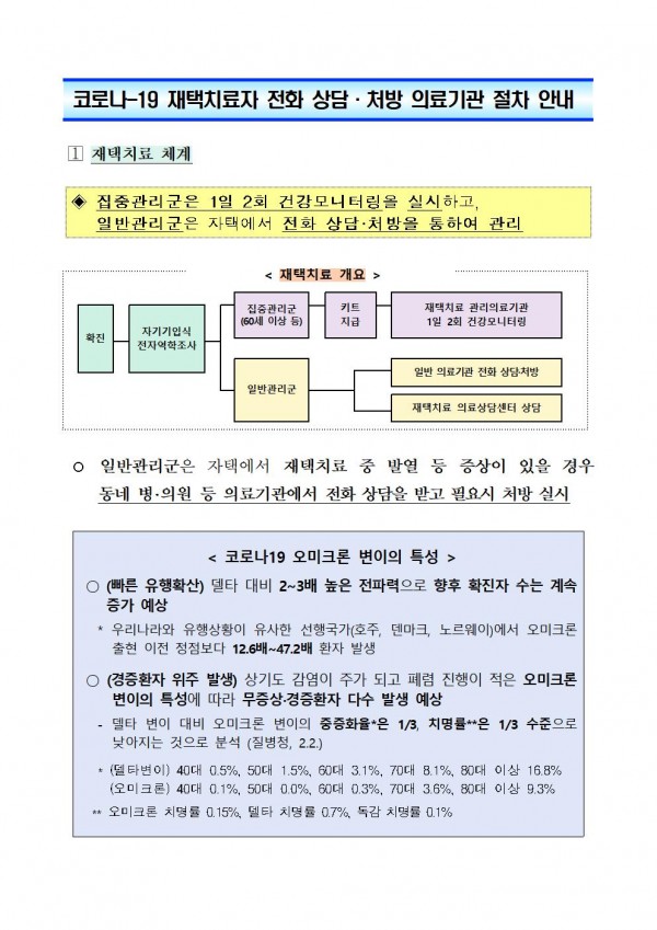 [중수본]재택치료 일반관리군에 대한 전화 상담 및 처방 주요 내용 안내(02.10.) 대피연 메일보내기 이름으로 검색 0 10,548 2022.02.10 15:39 첨부파일 - 첨부파일: 붙임1.요약재택치료자 전화 상담·처방 의료기관 절차 안내최종 1.hwp (21.5K) 127 - 첨부파일: 붙임2.재택치료자 전화 상담·처방 의료기관 절차 안내.hwp (425.5K) 130 - 첨부파일: 중수본공문.jpg (338.5K) 98 짧은주소 - 짧은주소: https://laserpro.or.kr:443/bbs/?t=9xr 주소복사 × 짧은 글주소 복사 Note! 위 주소를 드래그, 복사(Ctrl+C)하여 사용하세요. 이전글다음글 목록 본문 [중수본]재택치료 일반관리군에 대한 전화 상담 및 처방 주요 내용 안내(02.10.) *첨부파일:▷붙임1.(요약)재택치료자 전화 상담·처방 의료기관 절차 안내(최종) (1)▷붙임2.재택치료자 전화 상담·처방 의료기관 절차 안내. 이전글다음글 목록 댓글목록 등록된 댓글이 없습니다.
