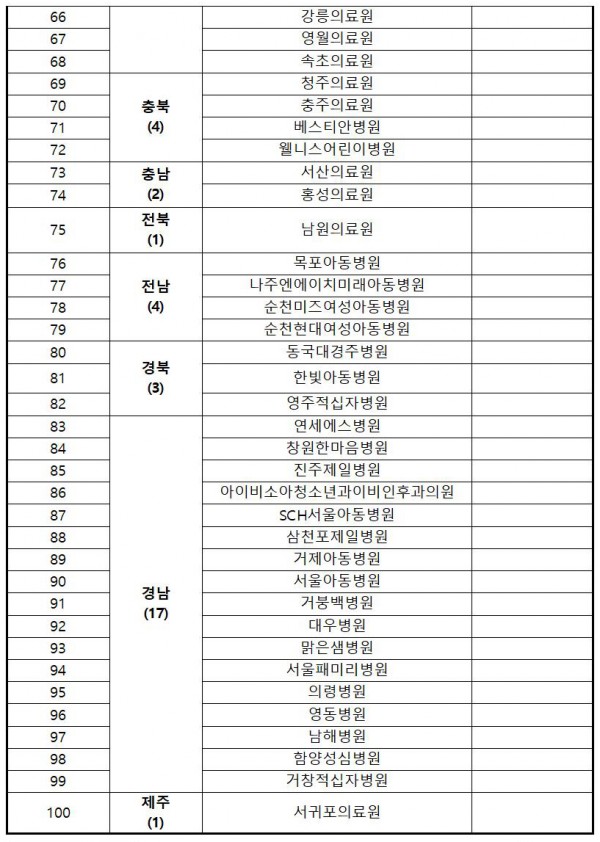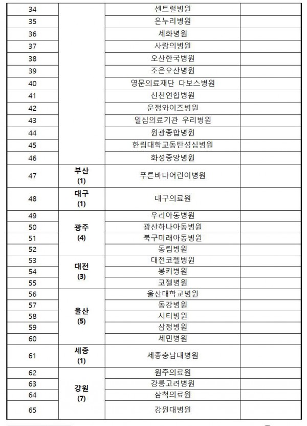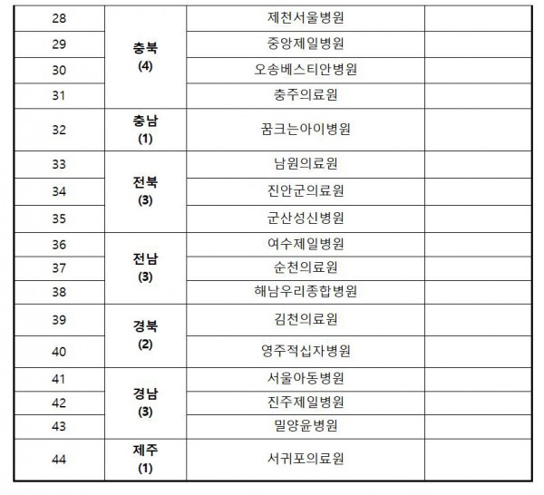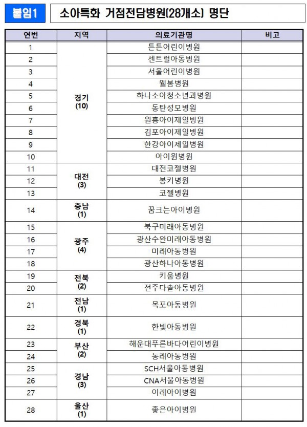 1. 소아특화 거점전담병원(28개소) 명단