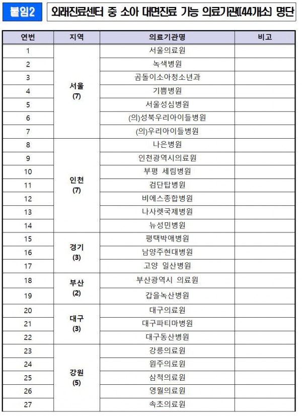 2. 외래진료센터 등 소아 대면진료 가능 의료기관(44개소) 명단