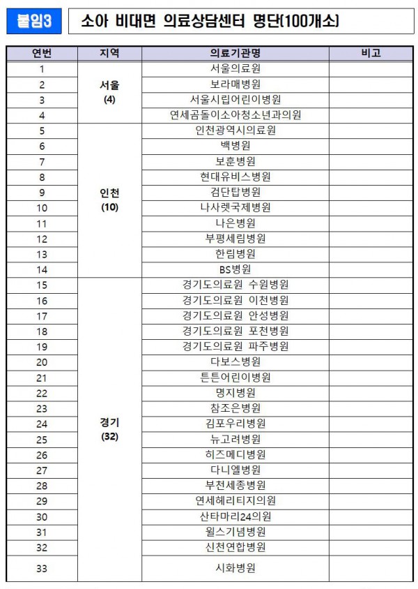 3. 소아 비대면 의료상담센터(100개소) 명단