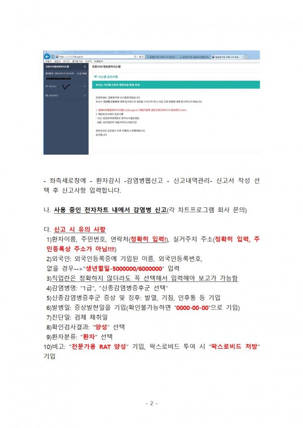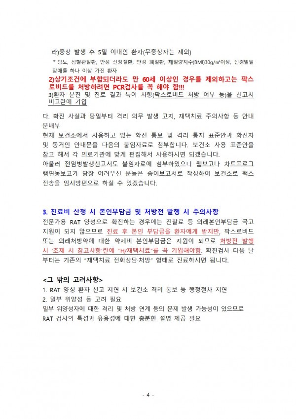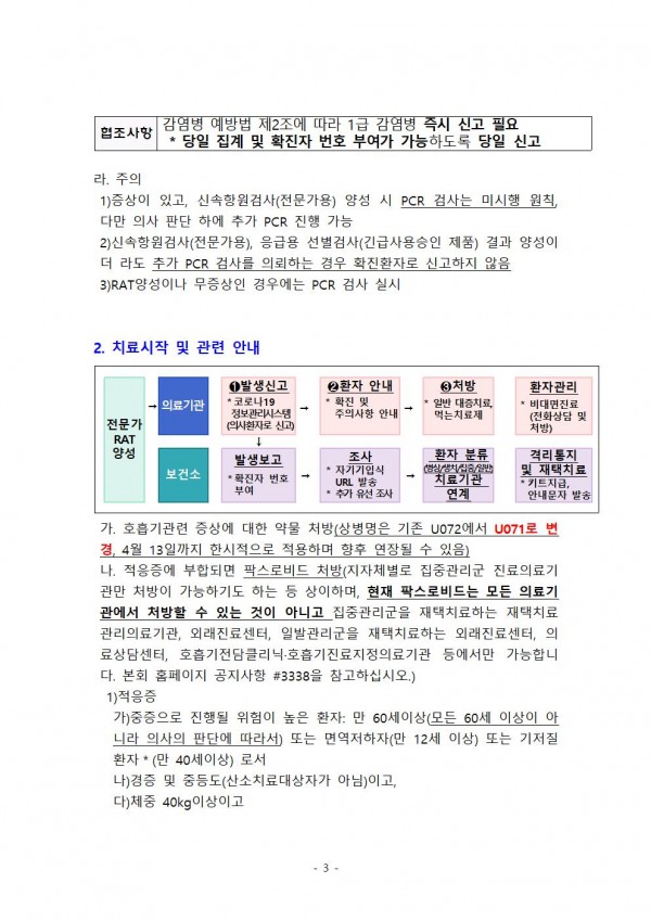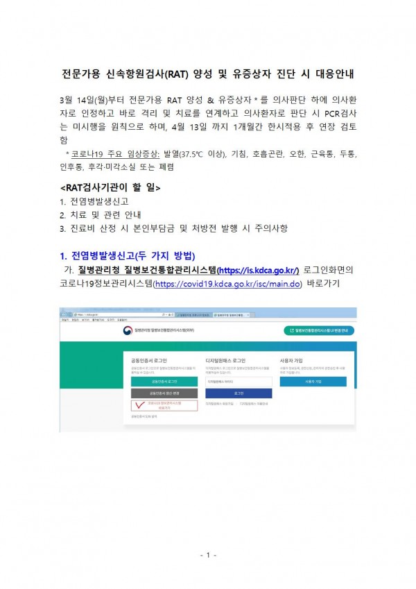 [의협]전문가용 신속항원검사(RAT) 양성 및 유증상자 진단 시 대응안내(전염병 발생 신고, 처방, 청구방법, 각종 안내문)