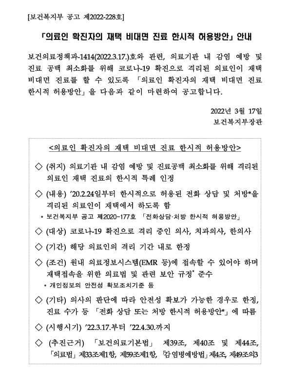 보건의료정책과-1414(2022.3.17.)호와 관련, 의료기관 내 감염 예방 및 진료 공백 최소화를 위해 코로나-19 확진으로 격리된 의료인이 재택 비대면 진료를 할 수 있도록 「의료인 확진자의 재택 비대면 진료 한시적 허용방안」을 다음과 같이 마련하여 공고합니다.