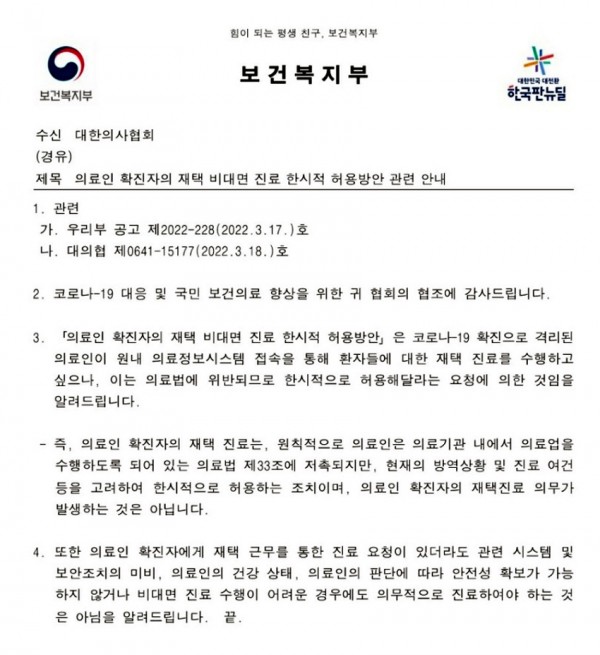 「의료인 확진자의 재택 비대면 진료 한시적 허용방안」안내
