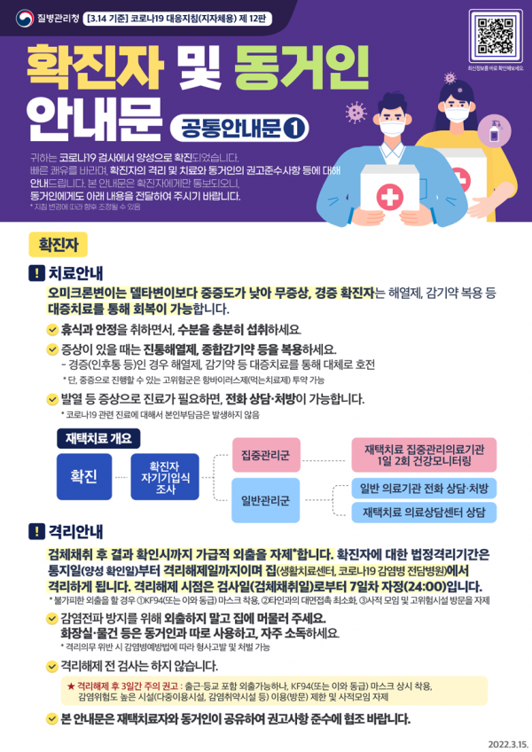 [질병청]코로나19 재택치료 안내문(대응지침12판 기준).확진자.동거인.일반관리군.집중관리군