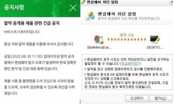 8월 30일 백신 프로그램 '알약'이 랜섬웨어가 아닌 정상 프로그램을 랜섬웨어로 잘못 인식해 차단 알림 메시지를 내보내는 등 오류를 일으키고 있다.