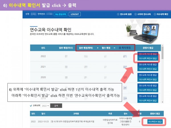 6) 위쪽에 “이수내역 확인서 발급” click 하면 1년치 이수내역 출력 가능