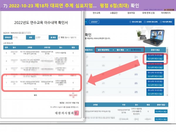 5) 세부 내역 확인 법 (이수평점 확인 및 증명서 출력 click)