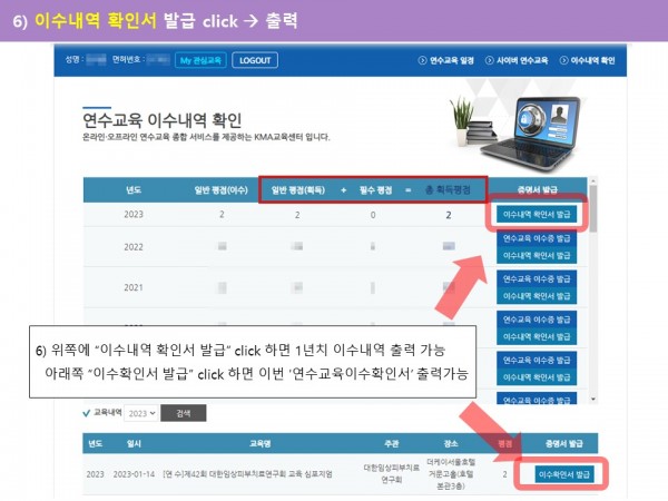 6) 위쪽에 “이수내역 확인서 발급” click 하면 1년치 이수내역 출력 가능