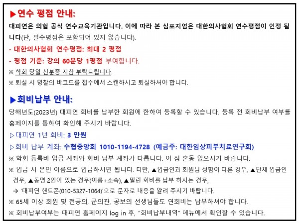 대피연은 의협 공식 연수교육기관입니다. 이에 따라 본 심포지엄은 대한의사협회 연수평점이 인정 됩니다(단, 필수평점은 포함되어 있지 않습니다).