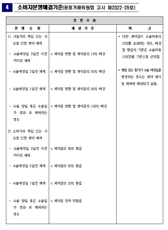 신청인(여, 50대)은 2022. 10. 25. 피신청인 의료기관에서 성형수술을 받기로 하고 5,000,000원을 납부한 후 계약일로부터 2주가량이 지난 상태에서(수술일 미정) 수술 취소 및 수술비 환급을 요구하자 납부한 수술비의 30%인 1,500,000원만 환급이 가능하다는 통보를 받음.