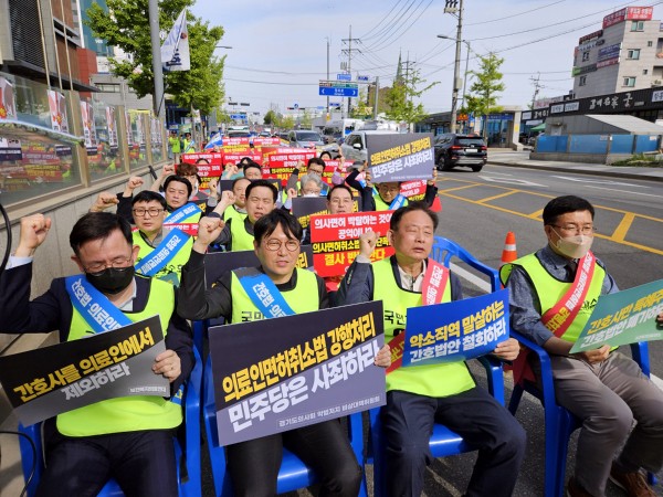 이에 경기도의사회는 악법저지를 위한 도내 일원 현수막 투쟁을 지속하는 동시에, 5월 3일 의협 비대위와 13개 보건의료연대와 발맞춰 희대의 악법을 강행한 더불어민주당 규탄 전국 궐기대회를 ’더불어민주당 경기도당사 앞‘에서 개최 하였습니다.