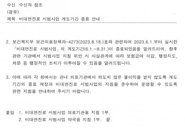 [복지부]비대면진료 시범사업 계도기간 종료안내(위반 시 삭감, 처분 가능)