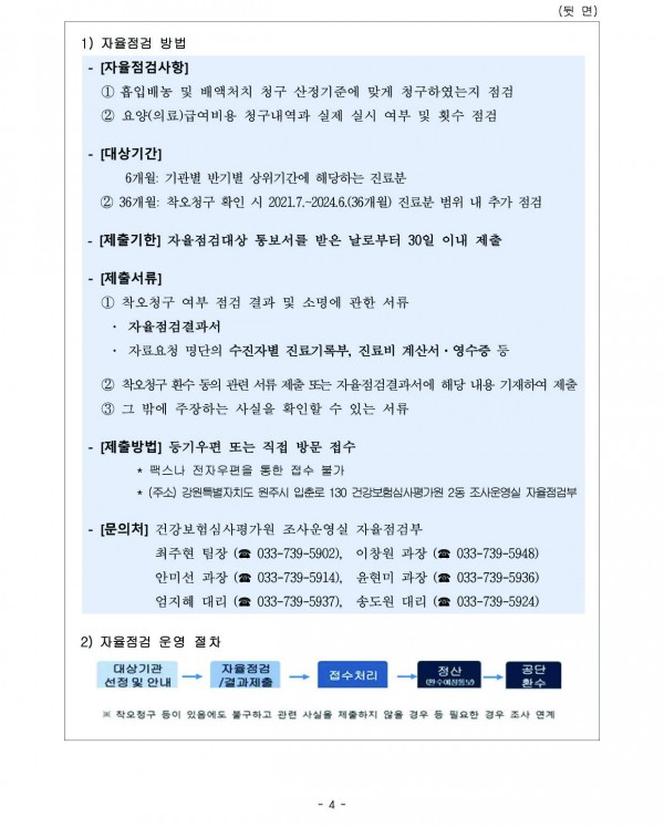(방법 및 절차) 심사평가원이 통보한 내역을 바탕으로 요양기관 스스로 진료내역을 점검하고 실제 진료행위 등에 대하여 [별첨 2] 자율점검 결과서와 입증자료를 함께 제출