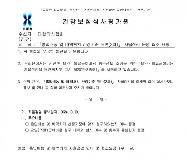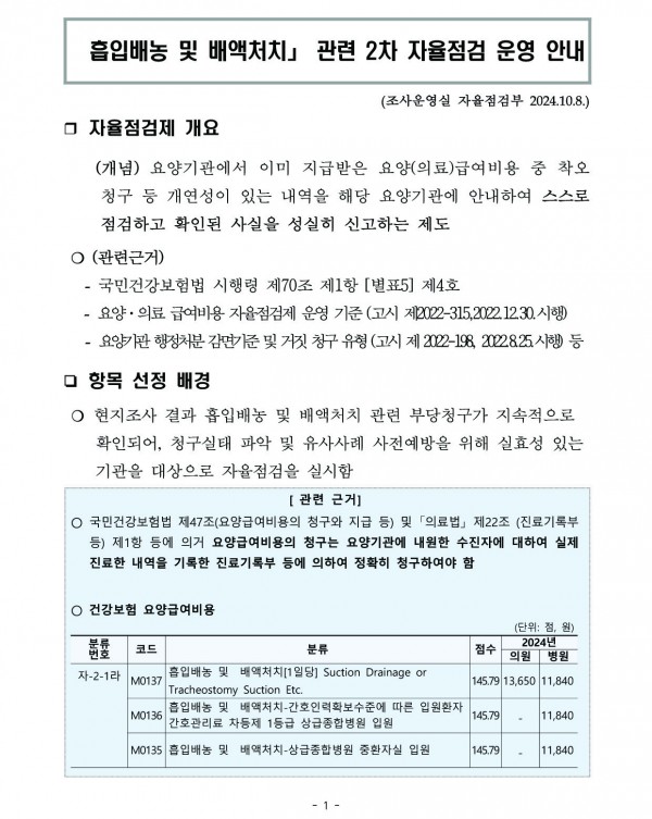 [심평원]‘흡입배농 및 배액처치 산정기준 위반(2차)’ 자율점검 운영 협조 요청