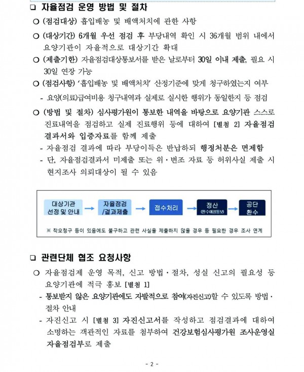 2. 심평원에서는 건전한 요양·의료급여비용 청구풍토 조성을 위한「요양·의료급여비용 자율점검제(보건복지부 고시 제2022-315호)」를 시행하고 있습니다.