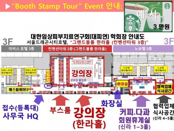 심포지엄 경품 추첨과는 별도로, 행사 당일 접수에서 나눠 드리는 “Booth Stamp Tour” 안내지에 총 42개 업체 중 20개 이상의 부스를 방문하시고 해당 부스에서 도장을 받아 오시는 분들께는 ‘3만원 커피 쿠폰’을 드리도록 하겠습니다.