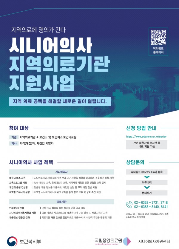 퇴직 혹은 퇴직 예정인 의사를 대상으로하여 보건복지부와 국립중앙의료원이 공동으로 지역에 은퇴한 의사를 재배치하는 “시니어의사 지역의료기관 지원사업”을 시행한다고 합니다.