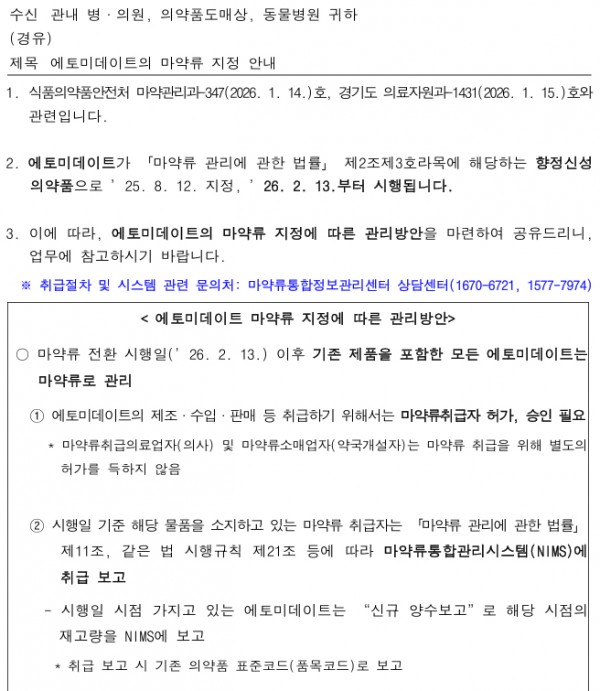 [식약처]에토미데이트의 마약류 지정 안내 대피연 메일보내기 이름으로 검색 0 60 2026.01.20 17:26 첨부파일 - 첨부파일: 에토미데이트의 마약류 지정 안내.pdf (263.2K) 0 - 첨부파일: 에토미데이트의 마약류 지정 안내1.jpg (224.5K) 0 - 첨부파일: 에토미데이트의 마약류 지정 안내2.jpg (147.7K) 0 짧은주소 - 짧은주소: https://www.laserpro.or.kr:443/bbs/?t=gBD 주소복사 × 짧은 글주소 복사 Note! 위 주소를 드래그, 복사(Ctrl+C)하여 사용하세요. 다음글 목록 본문 [식약처]에토미데이트의 마약류 지정 안내 다음글 목록 댓글목록 등록된 댓글이 없습니다.