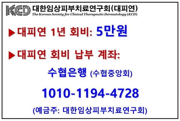 ▷회비 납부 계좌: 수협은행(수협중앙회) 1010-1194-4728 (예금주: 대한임상피부치료연구회)