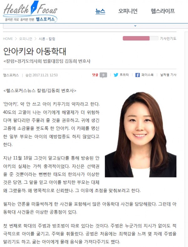 안아키와 아동학대, 대피연 법제이사 김동희 변호사 칼럼