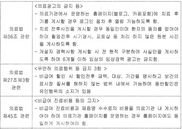 [홍보]홈페이지 운영관련 의료법 준수사항 대피연 메일보내기 이름으로 검색 0 16,338 2017.12.14 14:20 짧은주소 - 짧은주소: https://laserpro.or.kr:443/bbs/?t=24g 주소복사 × 짧은 글주소 복사 Note! 위 주소를 드래그, 복사(Ctrl+C)하여 사용하세요. 이전글다음글 목록 본문 [홍보]홈페이지 운영관련 의료법 준수사항의료기관 홈페이지 운영관련 의료법 관련 사항입니다. 의료법 제 56조에서는 객관적으로 인정되지 아니하거나 근거가 없는 내용을 포함하는 광고 및 거짓이나 과장된 내용의 광고를 금지하고 있습니다. 또한 의료법 제56조 제2항 및 같은 조 제3항을 위반한 자는 제63조에 따른 시정명령,제64조 제1항 5호 및 의료관계행정처분 규칙 별표 제2호 나목에 따라 업무정지처분에 해당한다고 합니다. 홈페이지를 운영하시는 회원님들께서는 유의 하시기 바랍니다. 이전글다음글 목록 댓글목록 등록된 댓글이 없습니다.