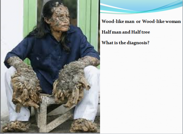 3) 가끔 해외 토픽난에 보면  윗 사진처럼 나무인간(wood-like man or half man and half tree)에 대한 기사가 보고되고 있는데, 나무인간의 진단명은 무엇이고 발생원인은 무엇일까?