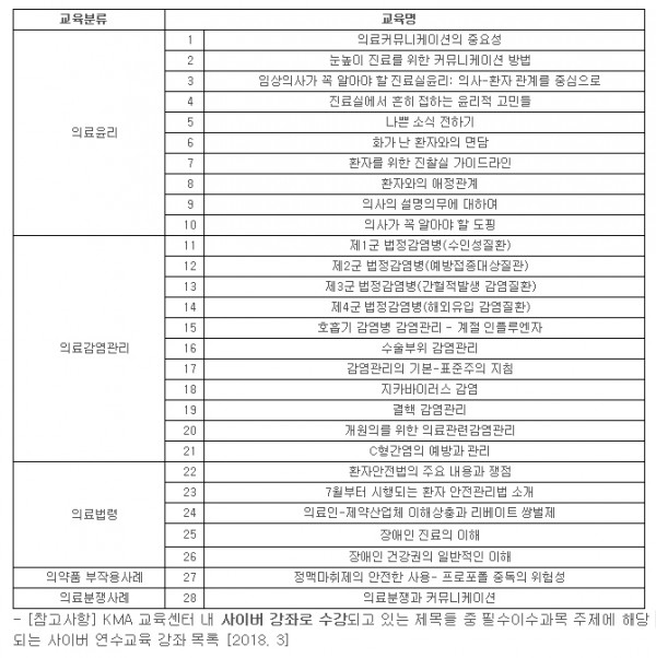 ① 의료윤리, ②의료법령, ③의료감염관리, ④의약품부작용 사례, ⑤의료분쟁사례