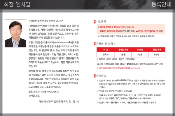 대한임상피부치료연구회(대피연) 회장을 맡고 있는 김동석입니다. 저희 대피연은 지난 5번의 정기 심포지엄과 4번의 교육심포지엄을 성공적으로 개최하여, 많은 회원님들로부터 관심을 받고 있습니다.