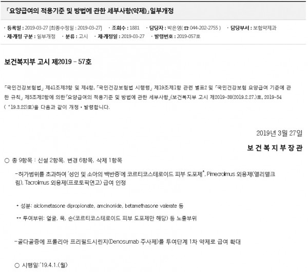 - 허가범위를 초과하여 ‘성인 및 소아의 백반증’에 코르티코스테로이드 피부 도포제*, Pimecrolimus 외용제(엘리델크림), Tacrolimus 외용제(프로토픽연고) 급여 인정