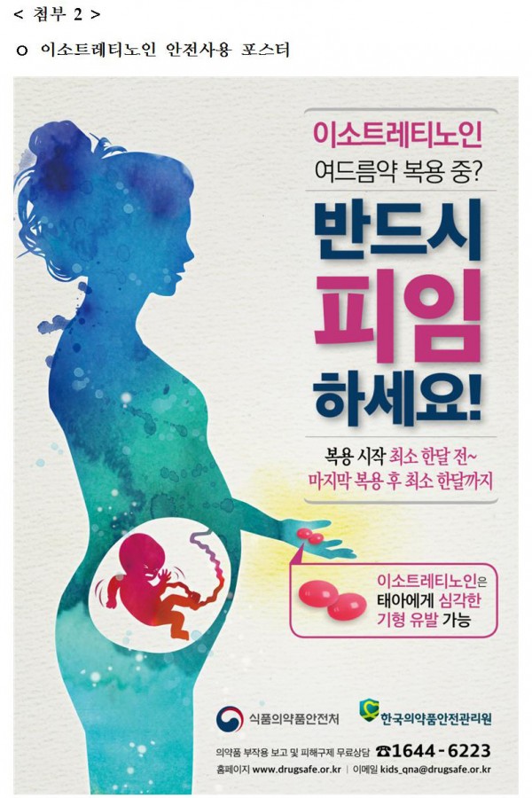 [식약처]여드름약 ‘이소트레티노인(isotretinoin)’ 등 레티노이드계 대상‘임신예방 프로그램’운영(30일만 처방가능)