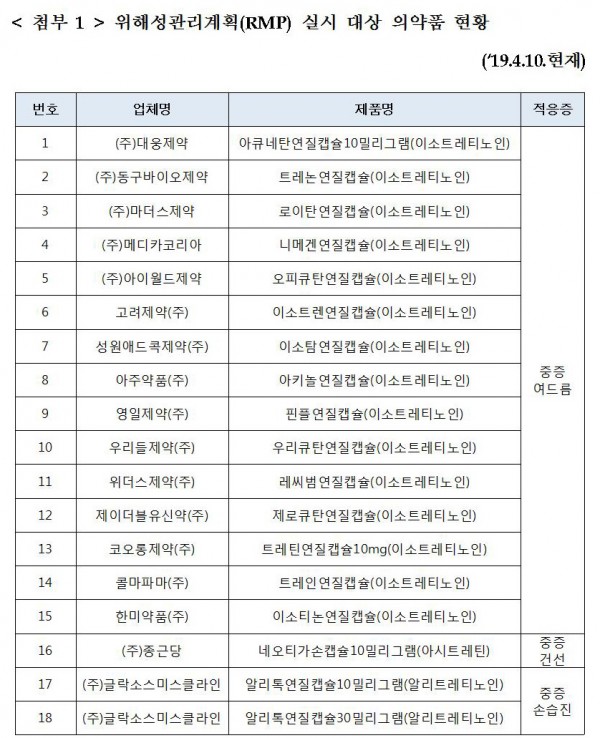 ○ 해당 제약사는 ‘레티노이드계’ 의약품의 태아기형유발 위험성과 주의사항을 포함한 안내서, 의·약사용 체크리스트, 환자용 동의서 등을 관련 병의원·약국에 배포하고 식약처에 이행상황을 보고해야 합니다.