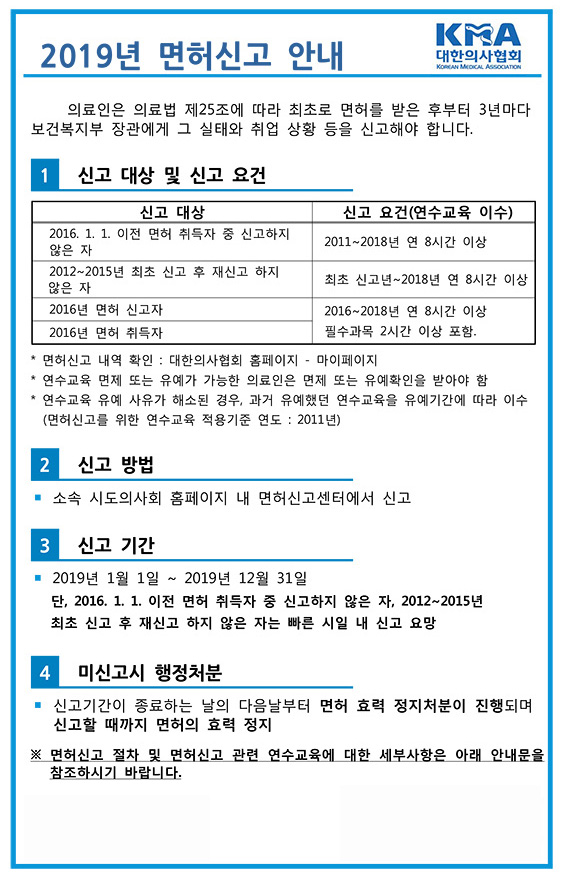 2019년 면허신고에 관련된 내용입니다. 해당 되시는 회원님들은 각자 속한 시도의사회를 통해서 신고하시면 됩니다.